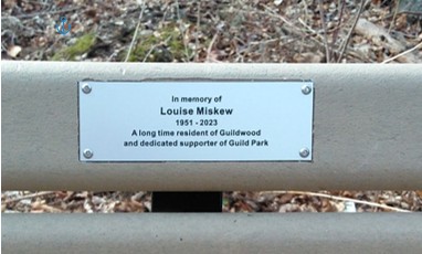 The commemorative bench was installed by the City of Toronto in late 2024, with the memorial plaque added a few weeks ago. The bench was sponsored by the Guild Renaissance Group, assisted by Friends of Guild Park.